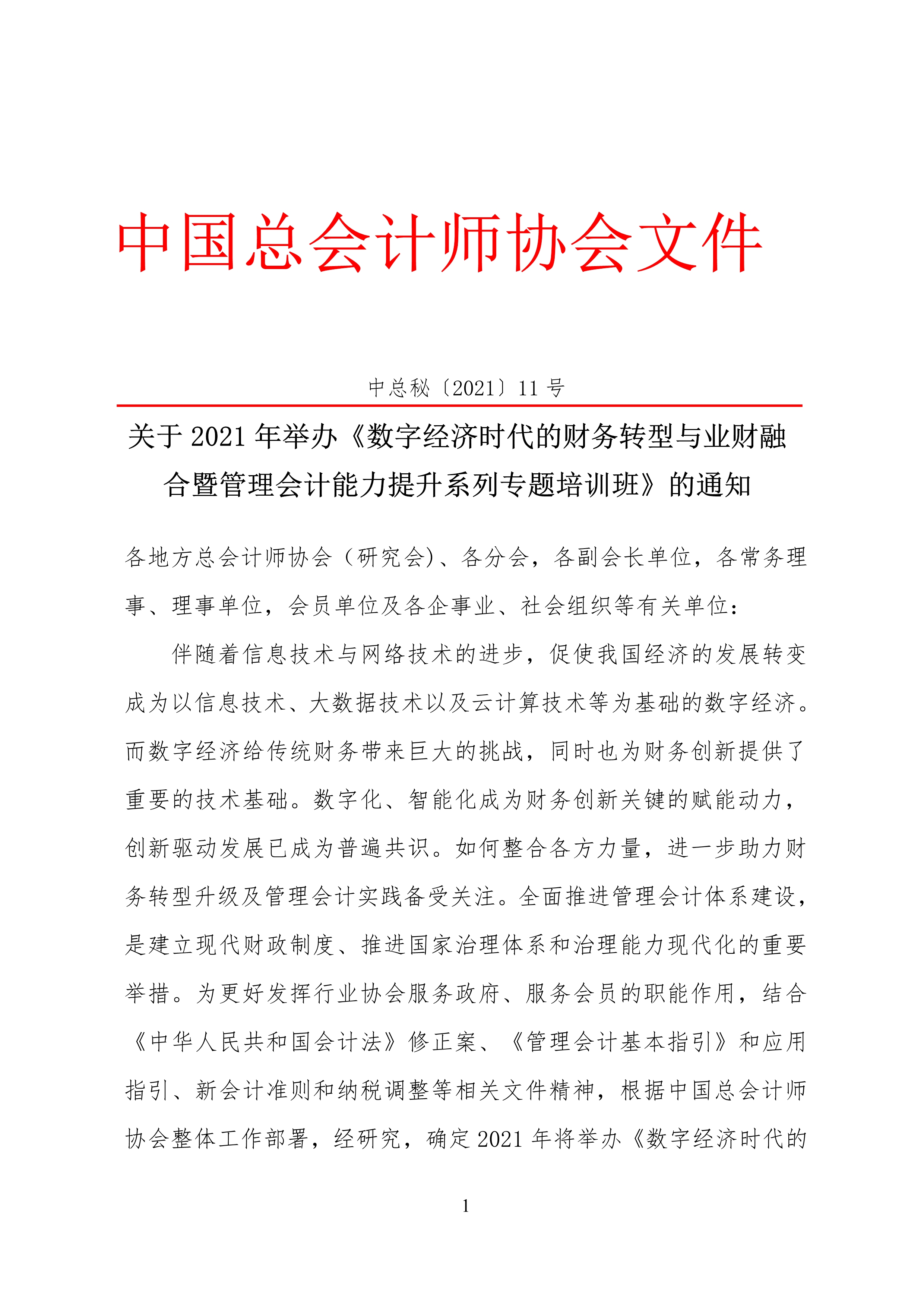 附件:中總秘[2021] 11號 關(guān)于2021年舉辦《數字經(jīng)濟時(shí)代的財務(wù)轉型與業(yè)財融合暨管理會(huì )計能力提升系列專(zhuān)題培訓班》的通知./upload/edit/file/20210220/20210220163220_17825.pdf